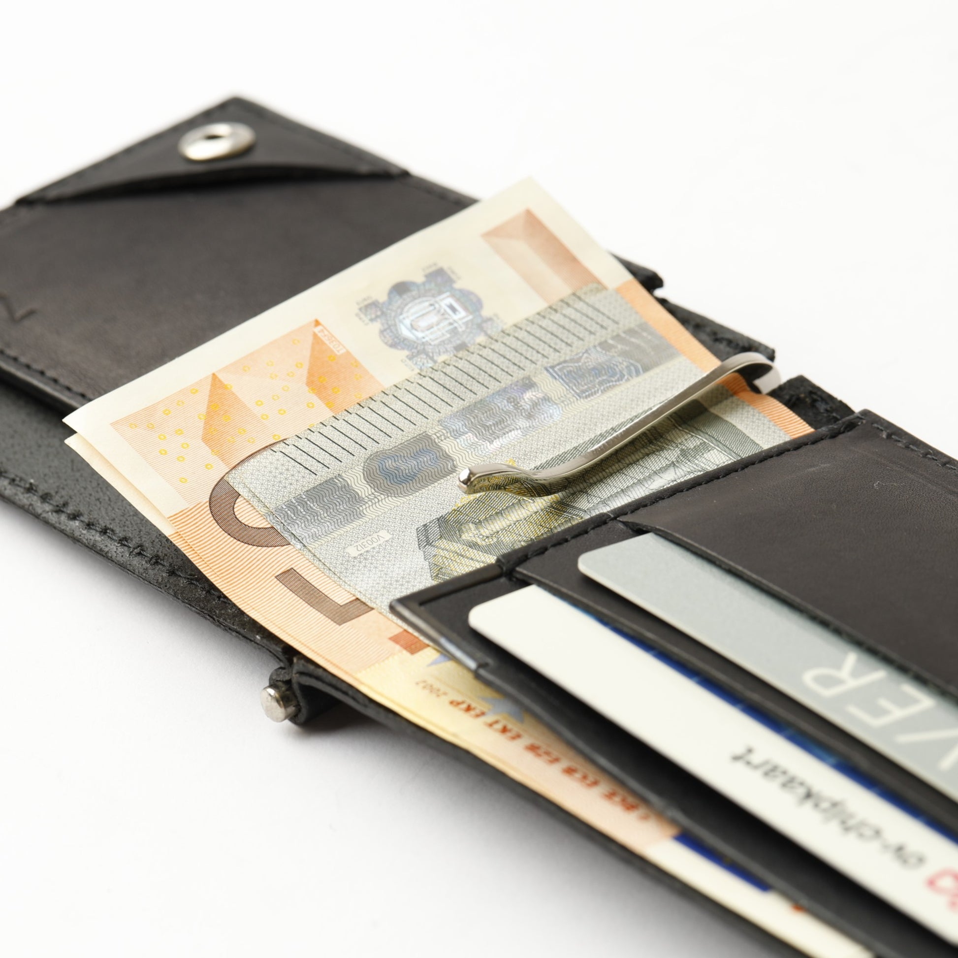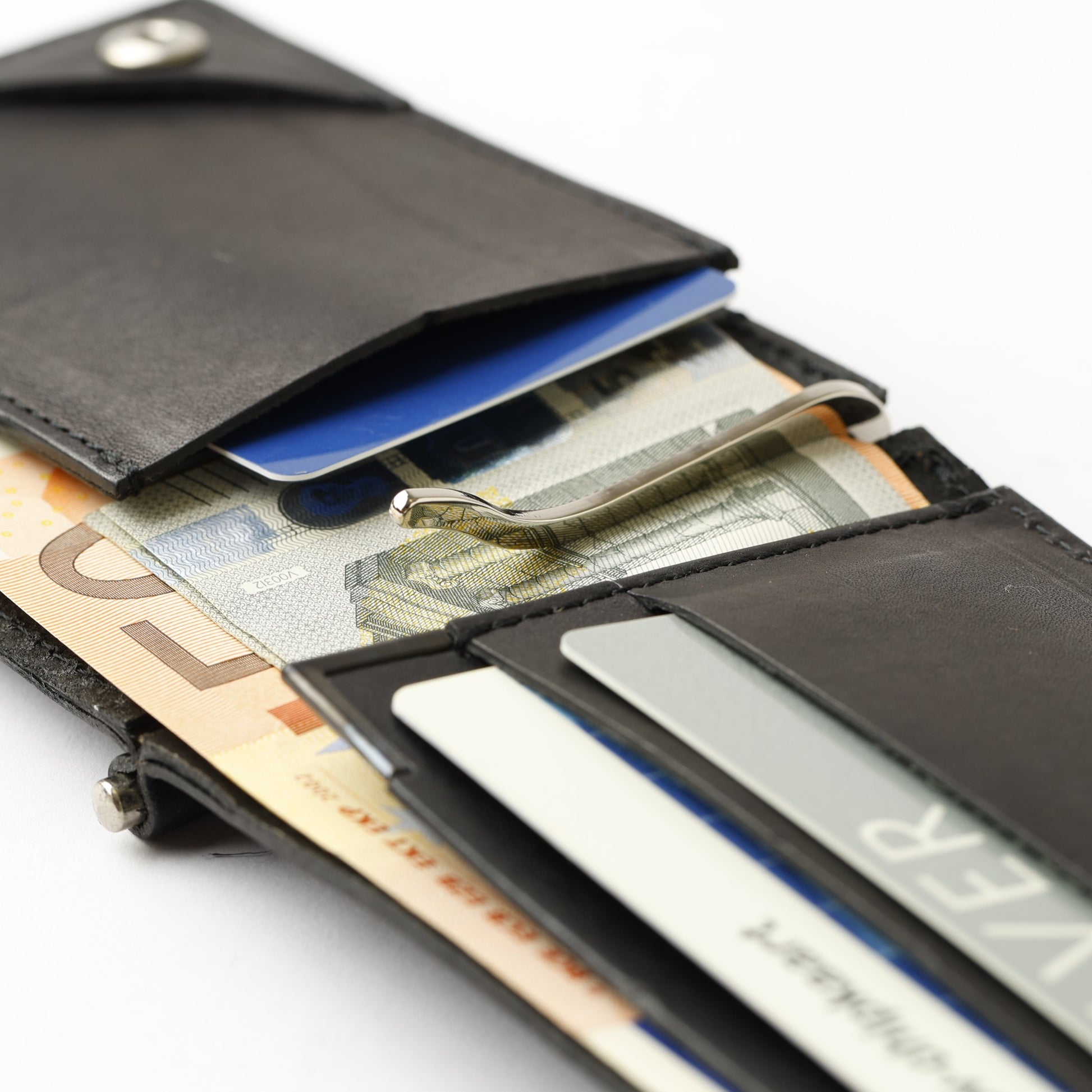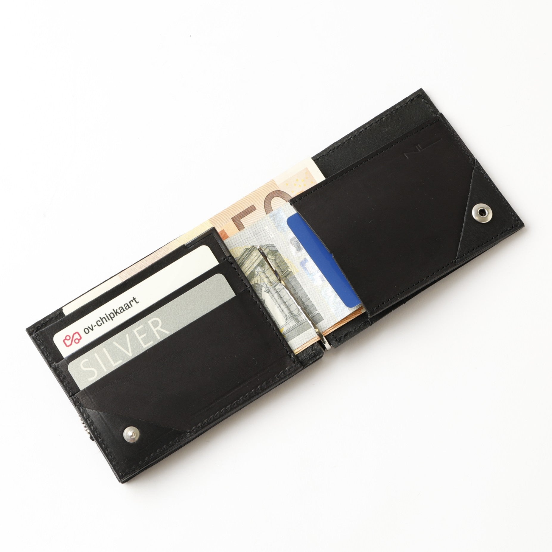 イタリア、トスカーナ地方のナナリに所在するタンナー「Conceria800社」製のフルベジタブル オイルドレザーを使用した、札ばさみ付2つ折りウォレット。