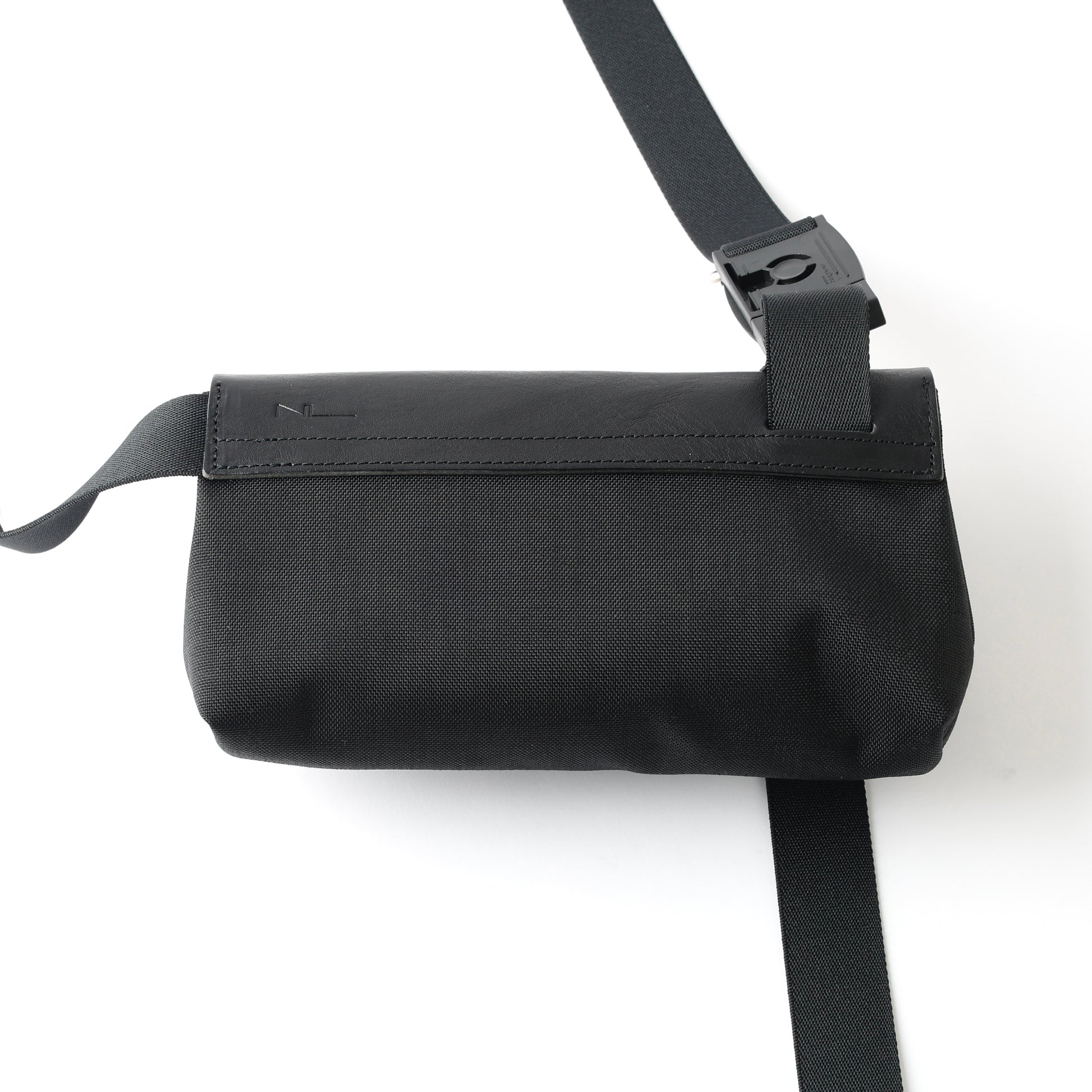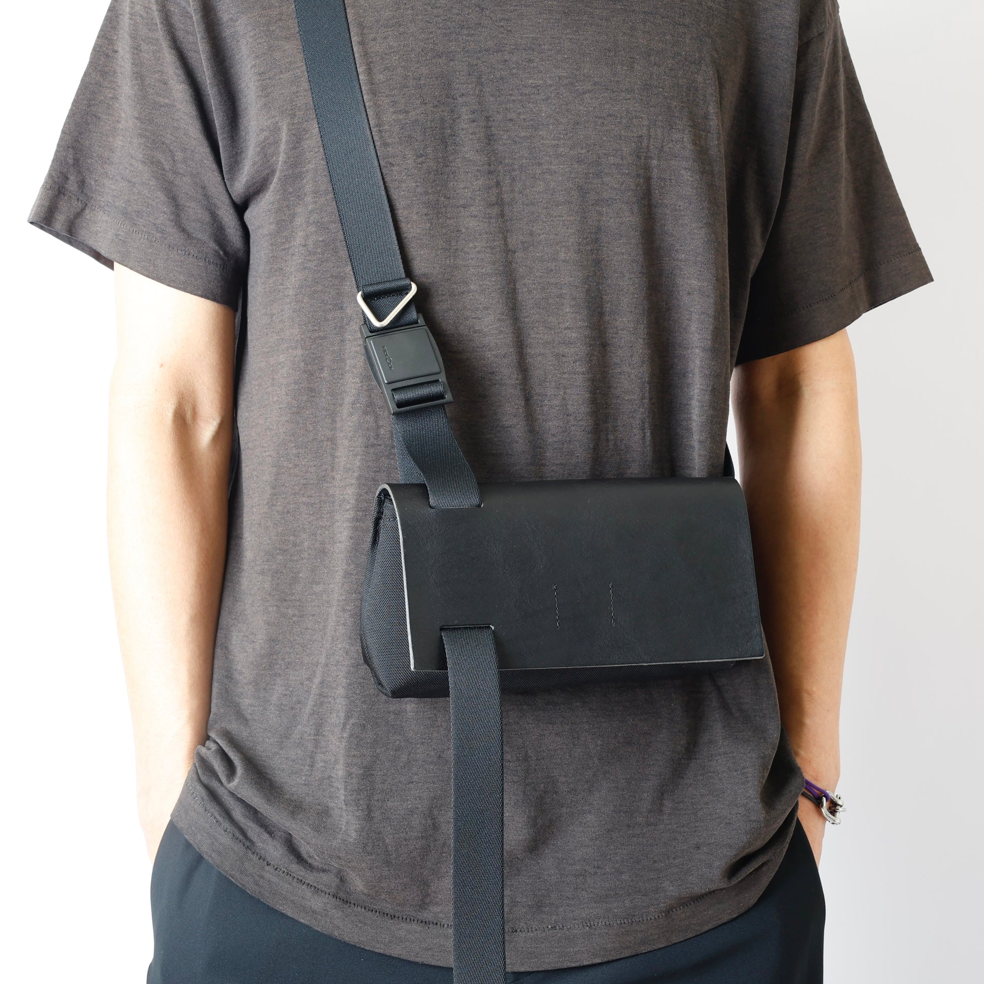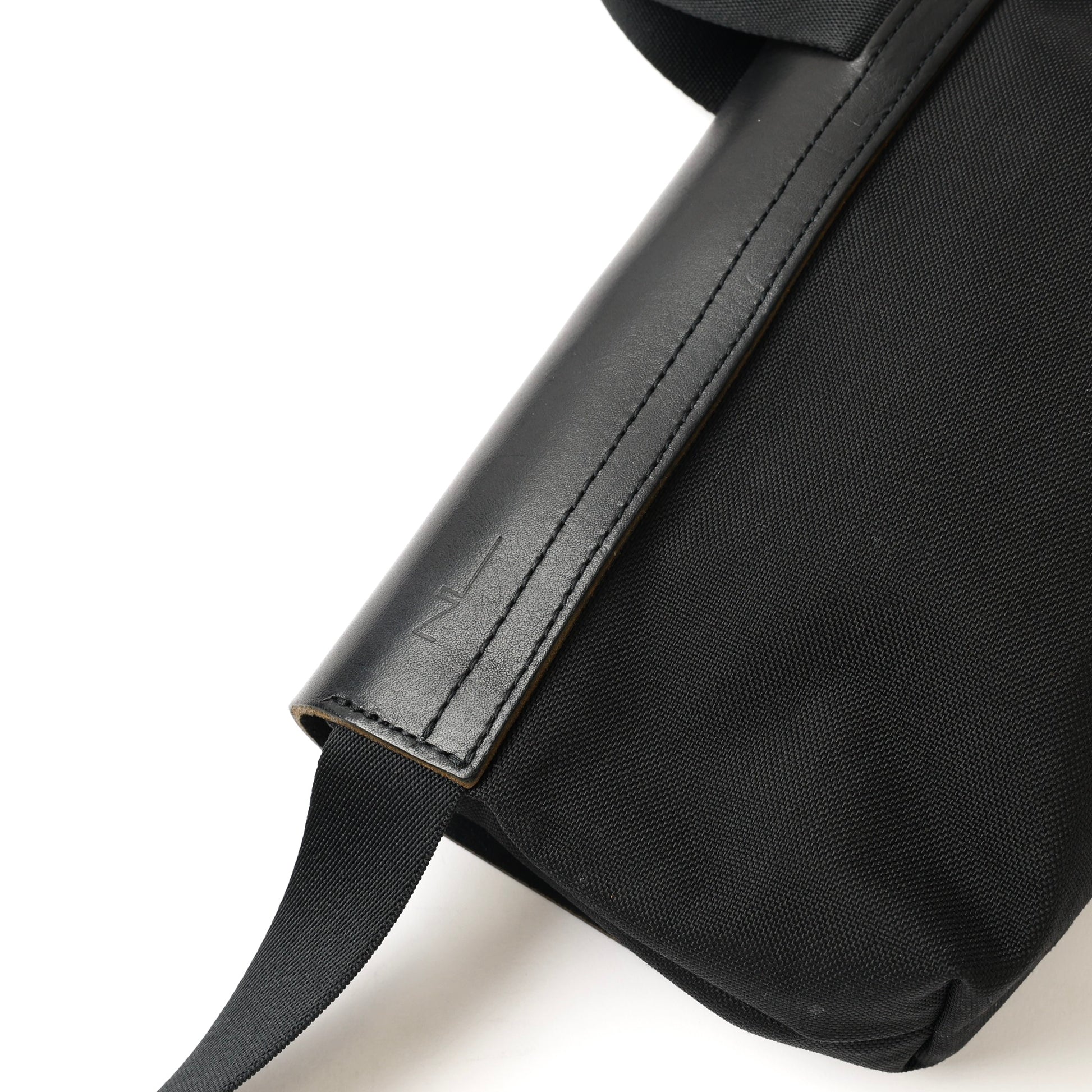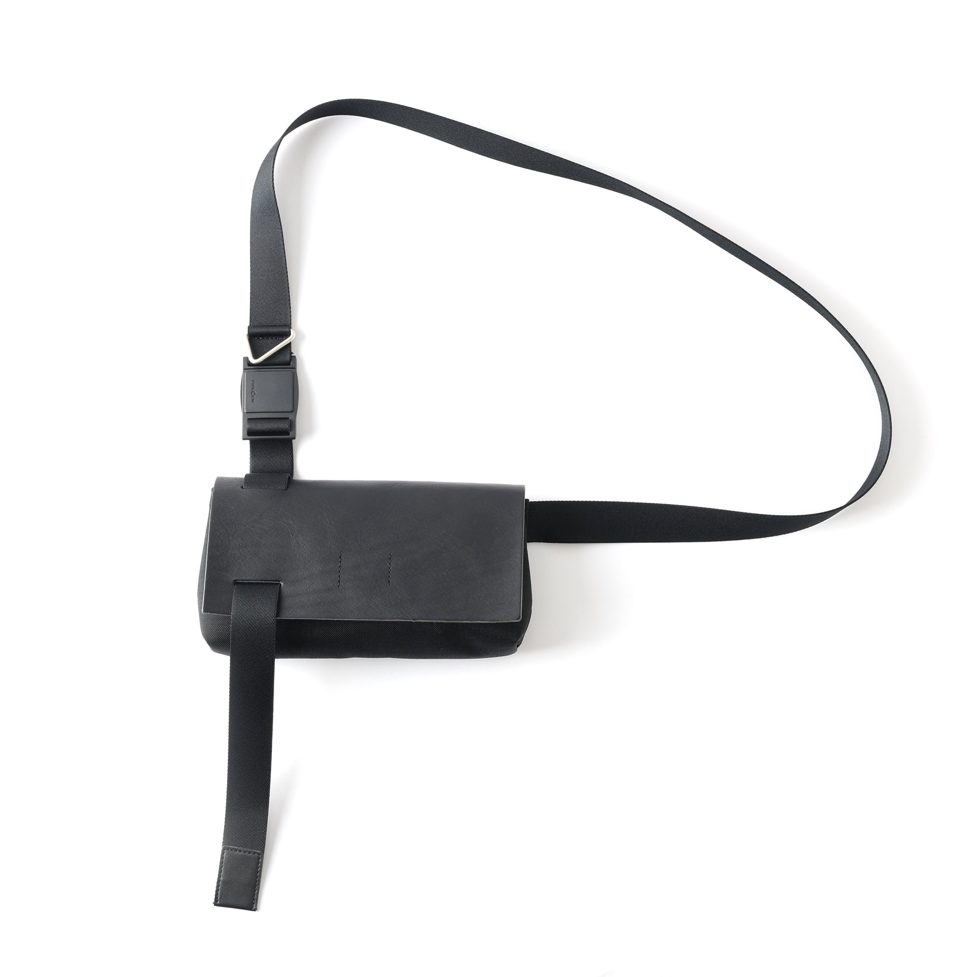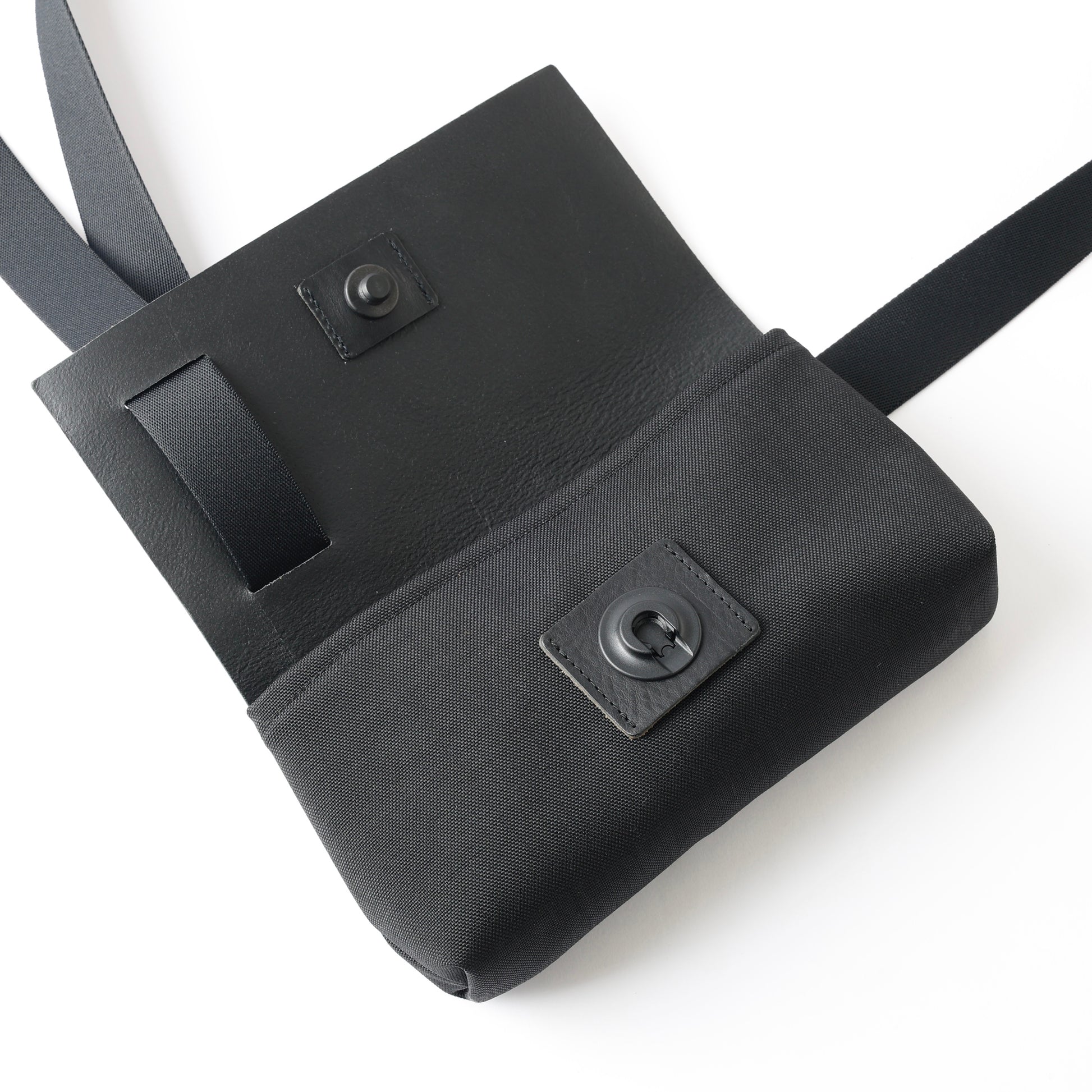 高強度ナイロンのボディにイタリア製ベジタブルタンニンレザーのフラップを使用した小型ショルダーバッグ。