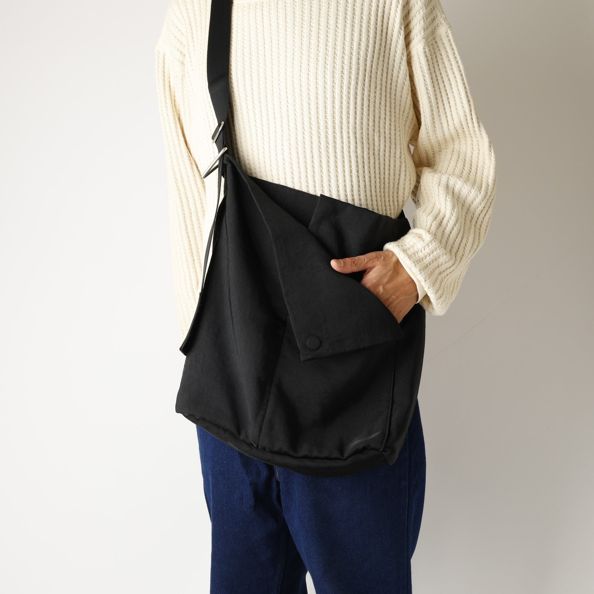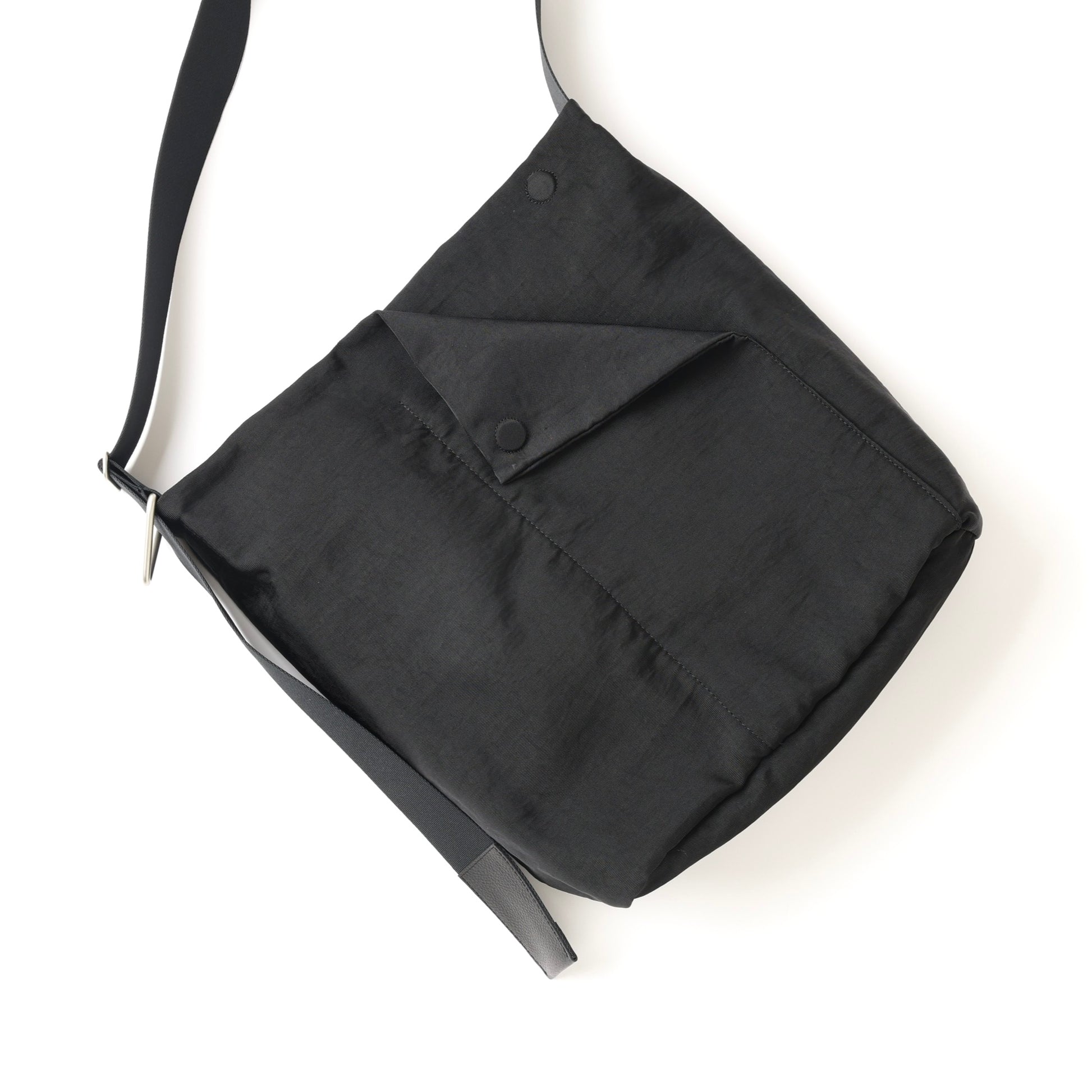 マグネットで開閉できるフラップを表面に配したショルダーバッグ。
