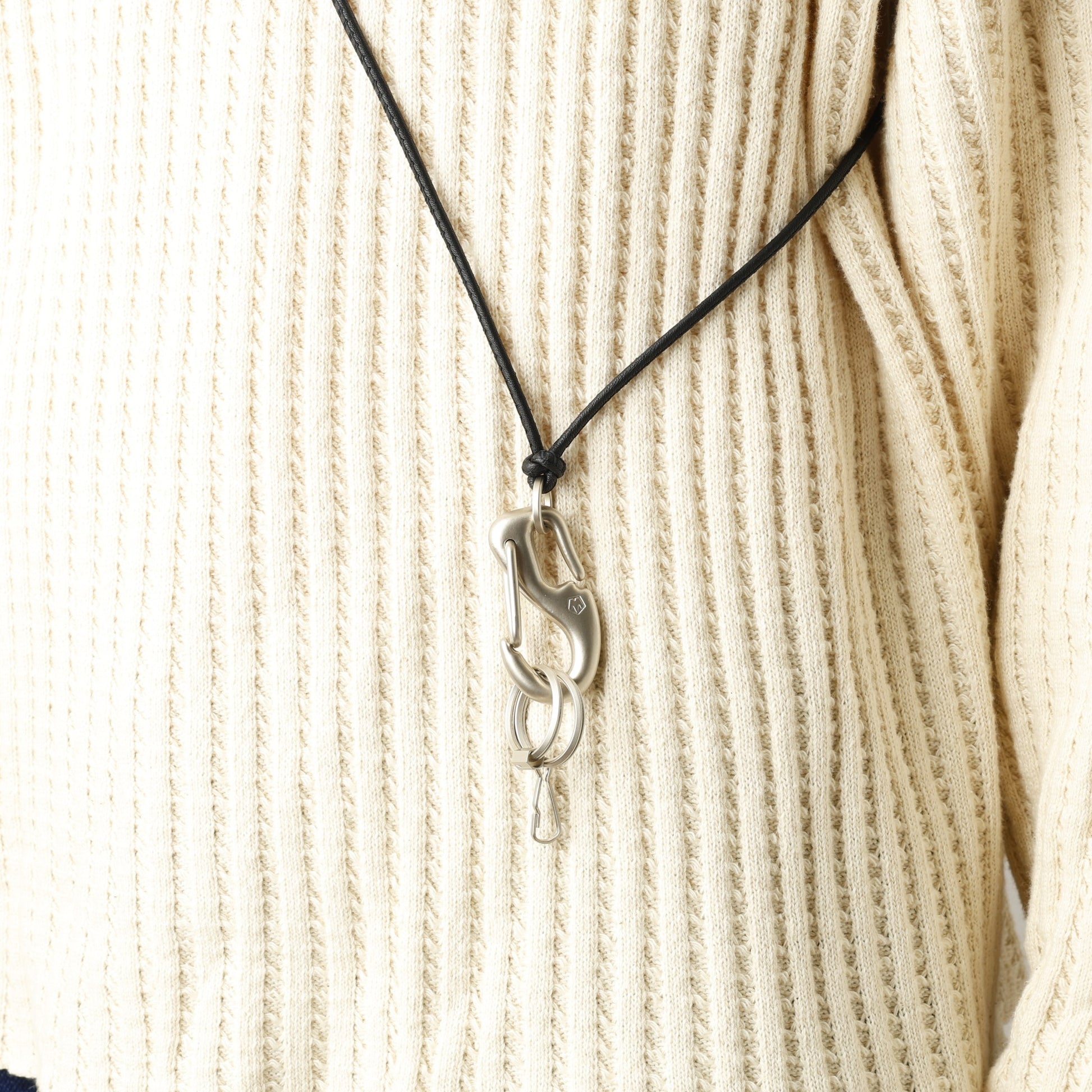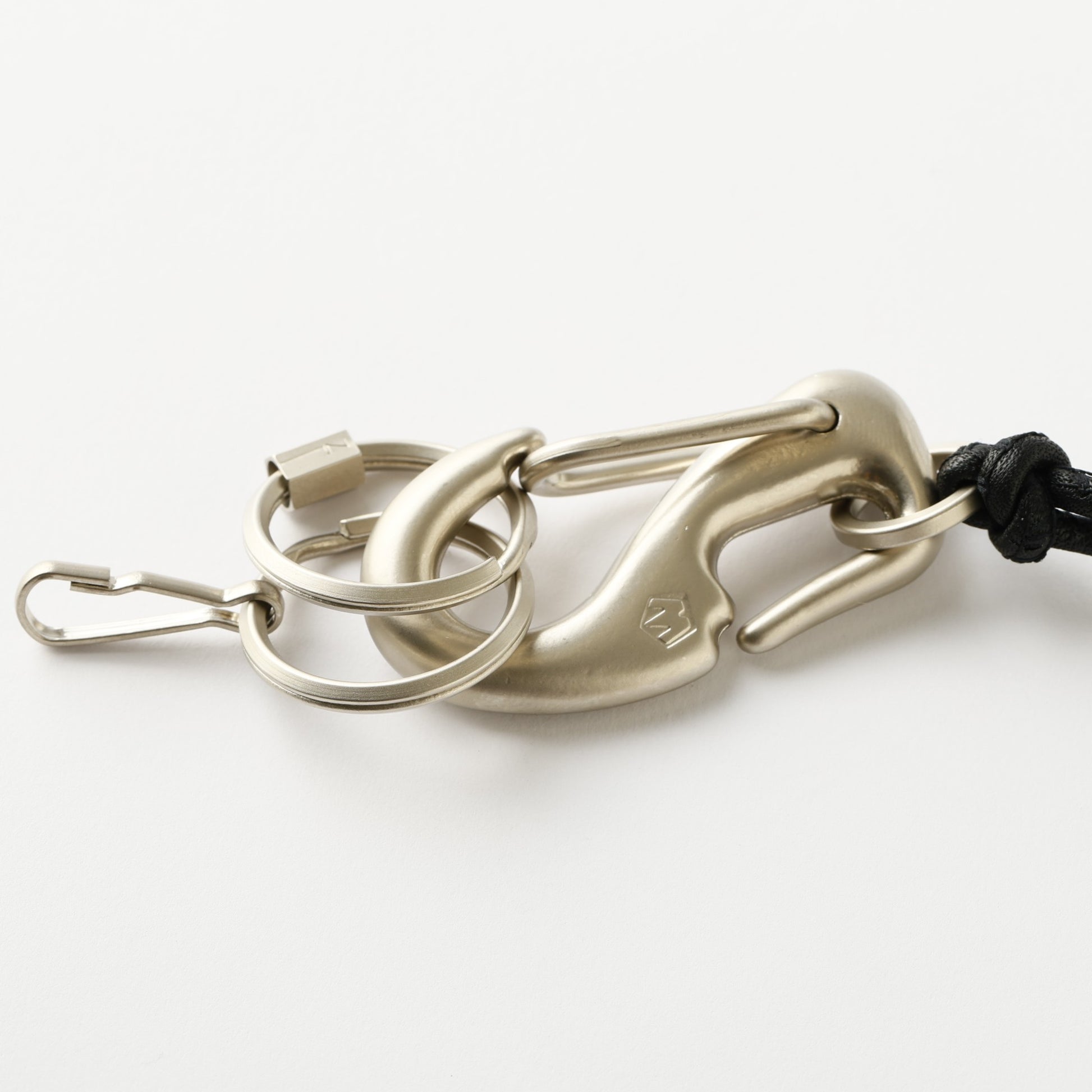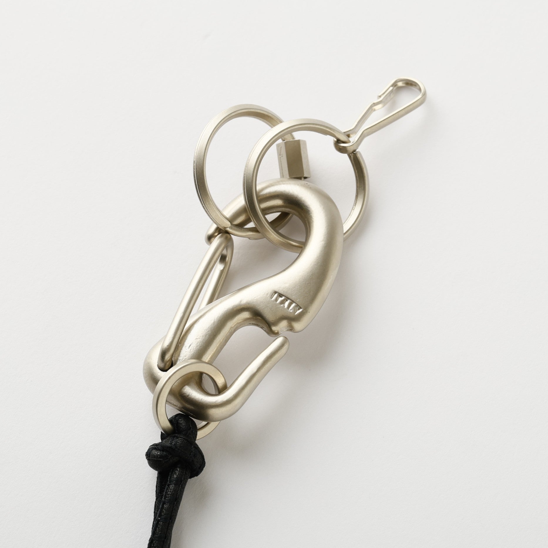 カラビナの質感に合わせ、先端の2つの二重カンとNL刻印の六角パーツには、半艶のメッキ加工を施しました。