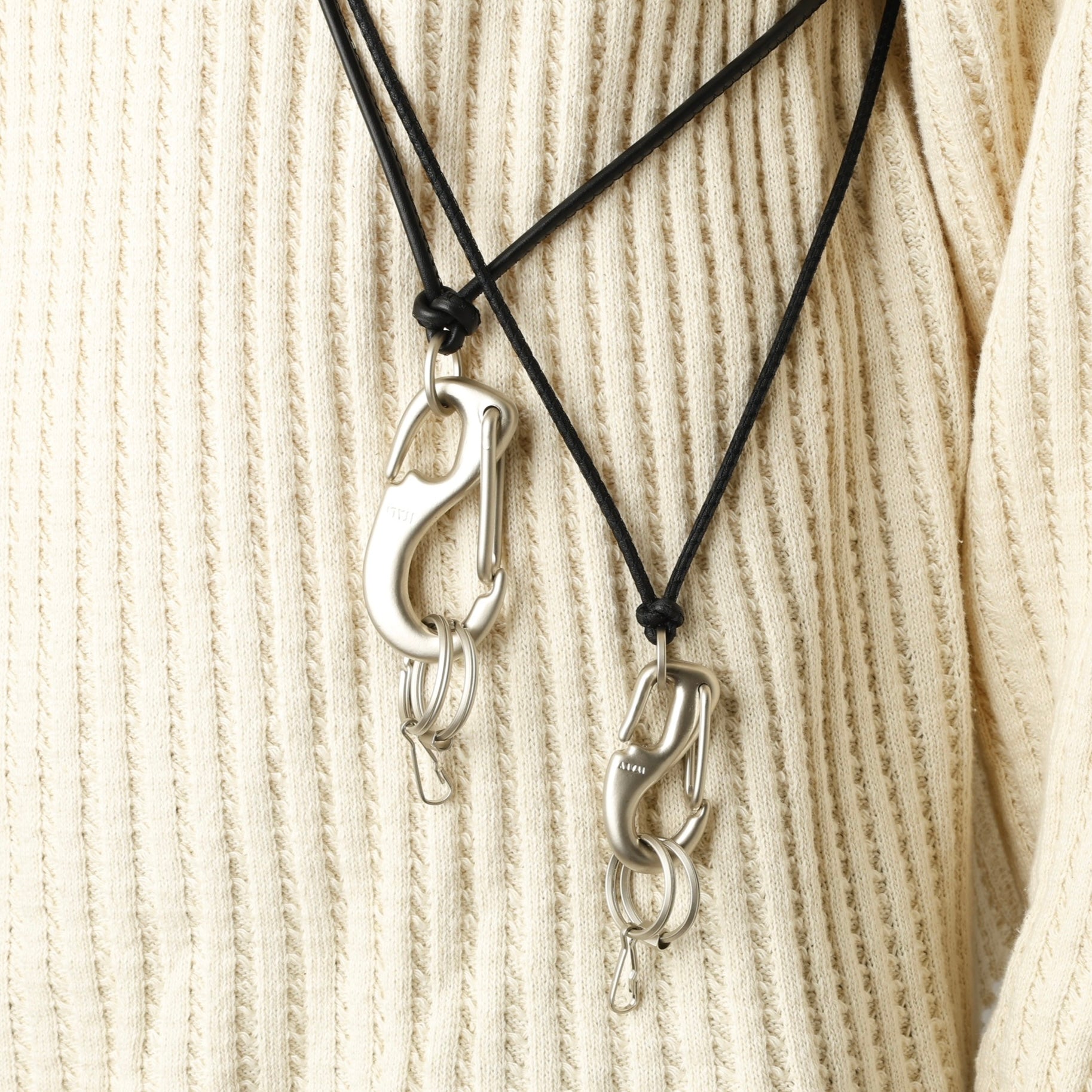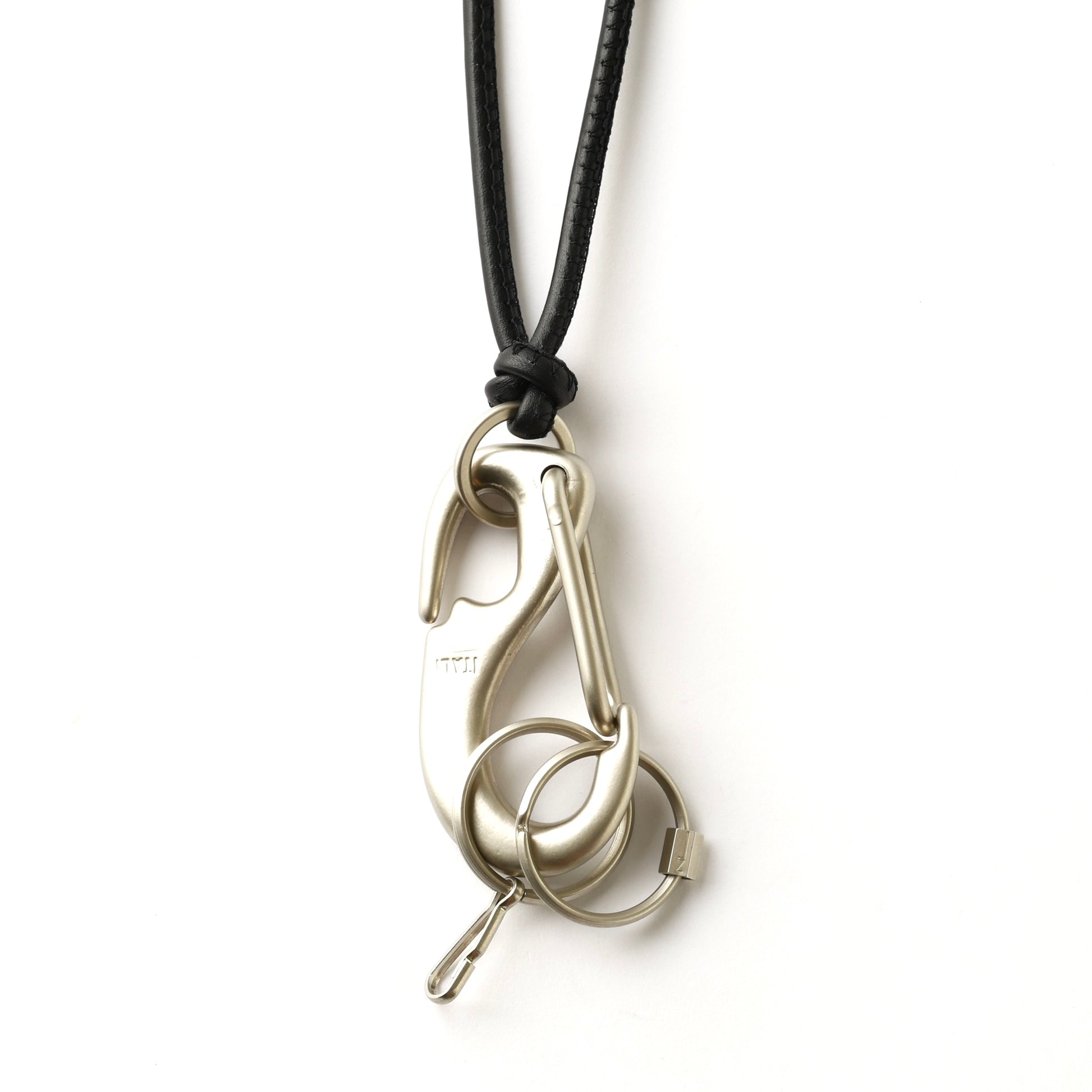 カラビナの質感に合わせ、先端の2つの二重カンとNL刻印の六角パーツには、半艶のメッキ加工を施しました。