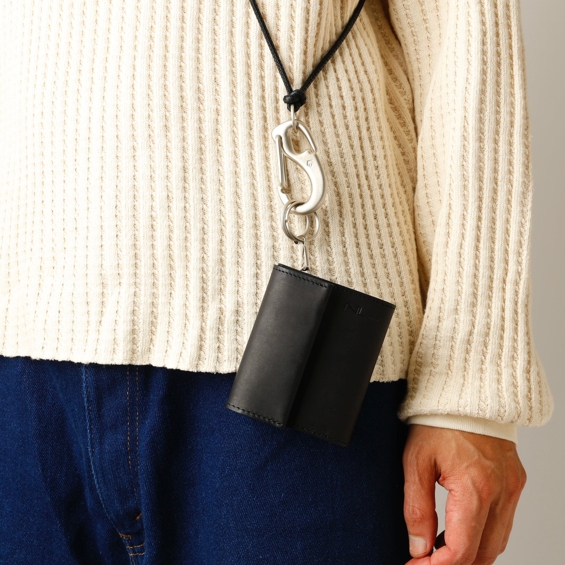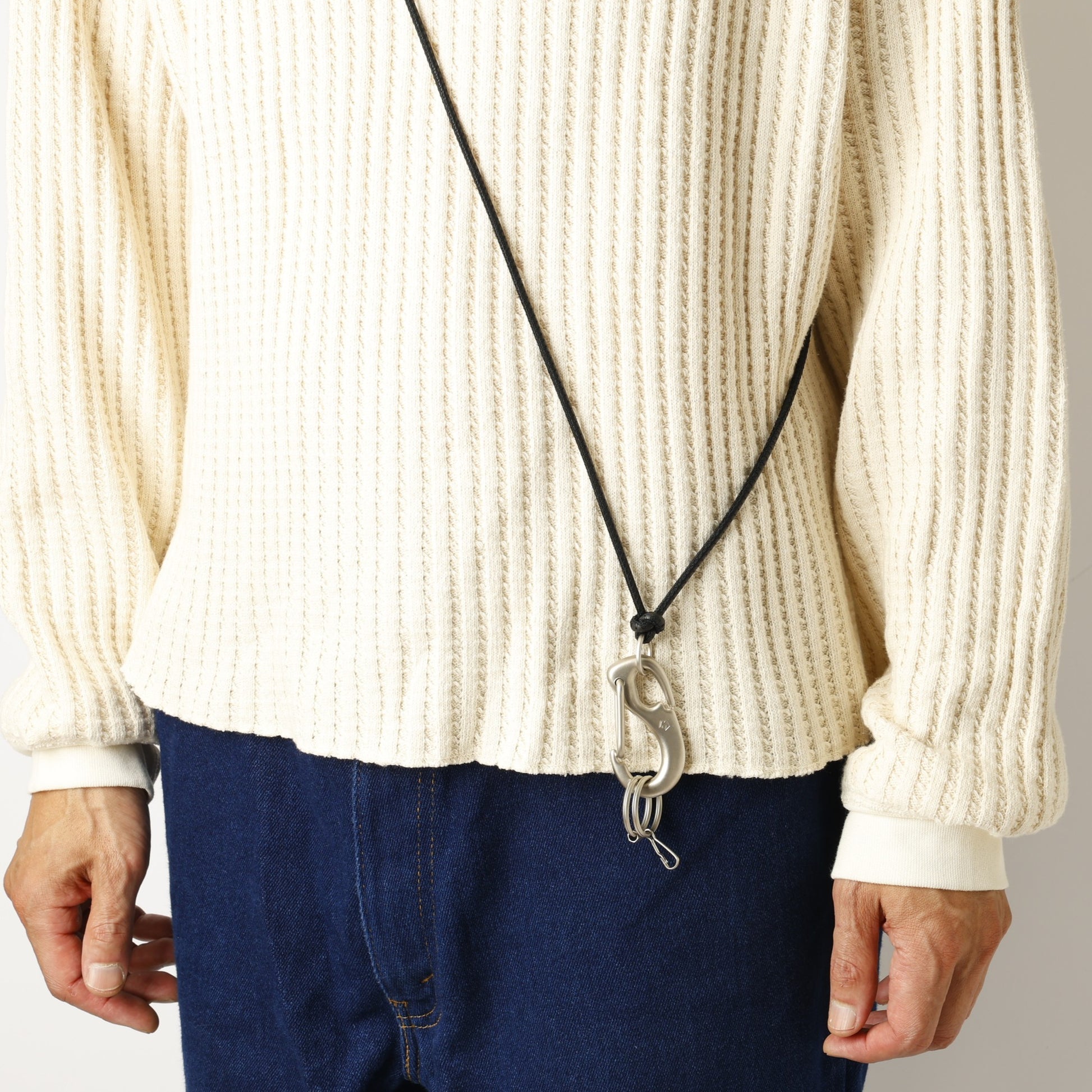 NLオリジナルで作成したレザーコードは全長をやや長めに設定し、長さの調整も可能。