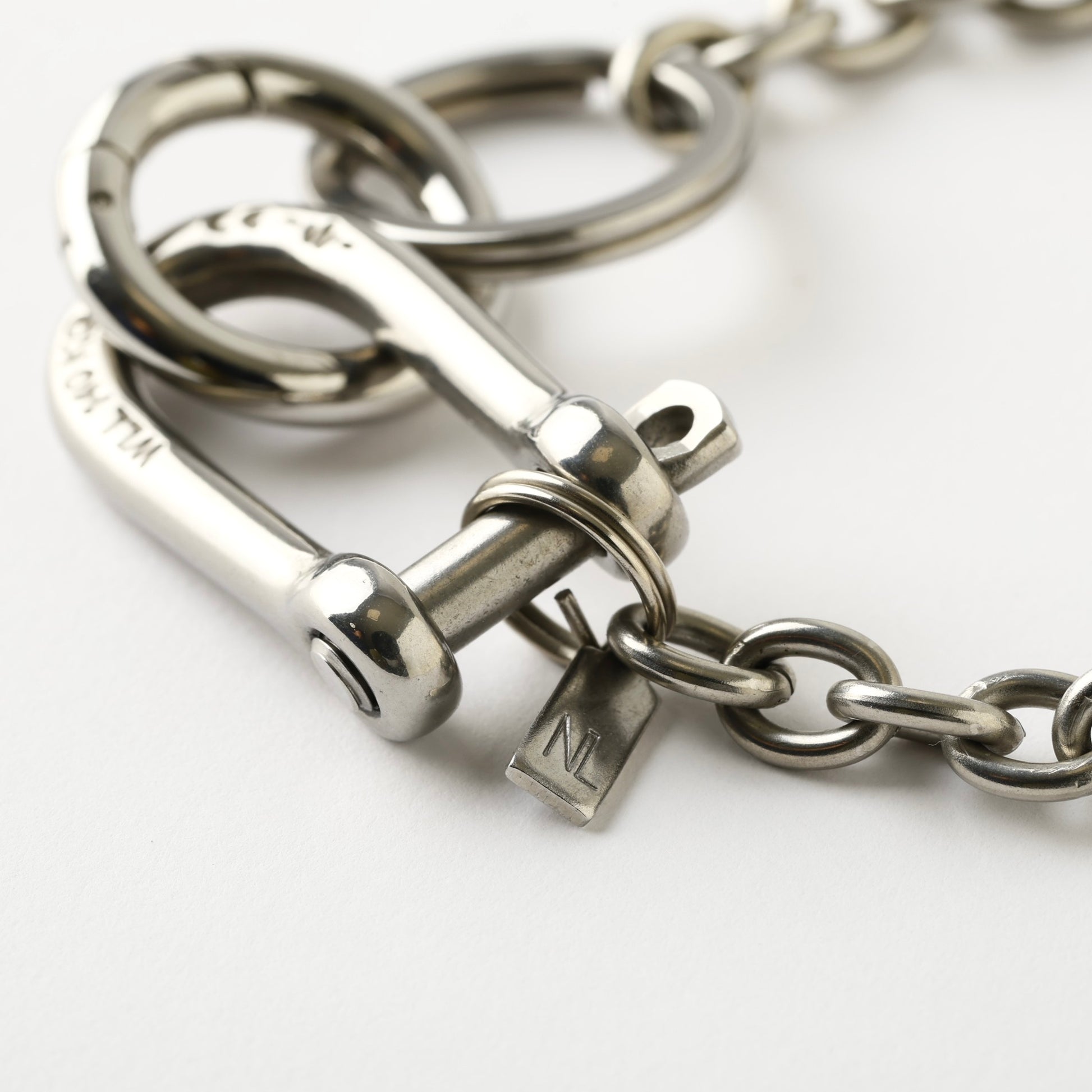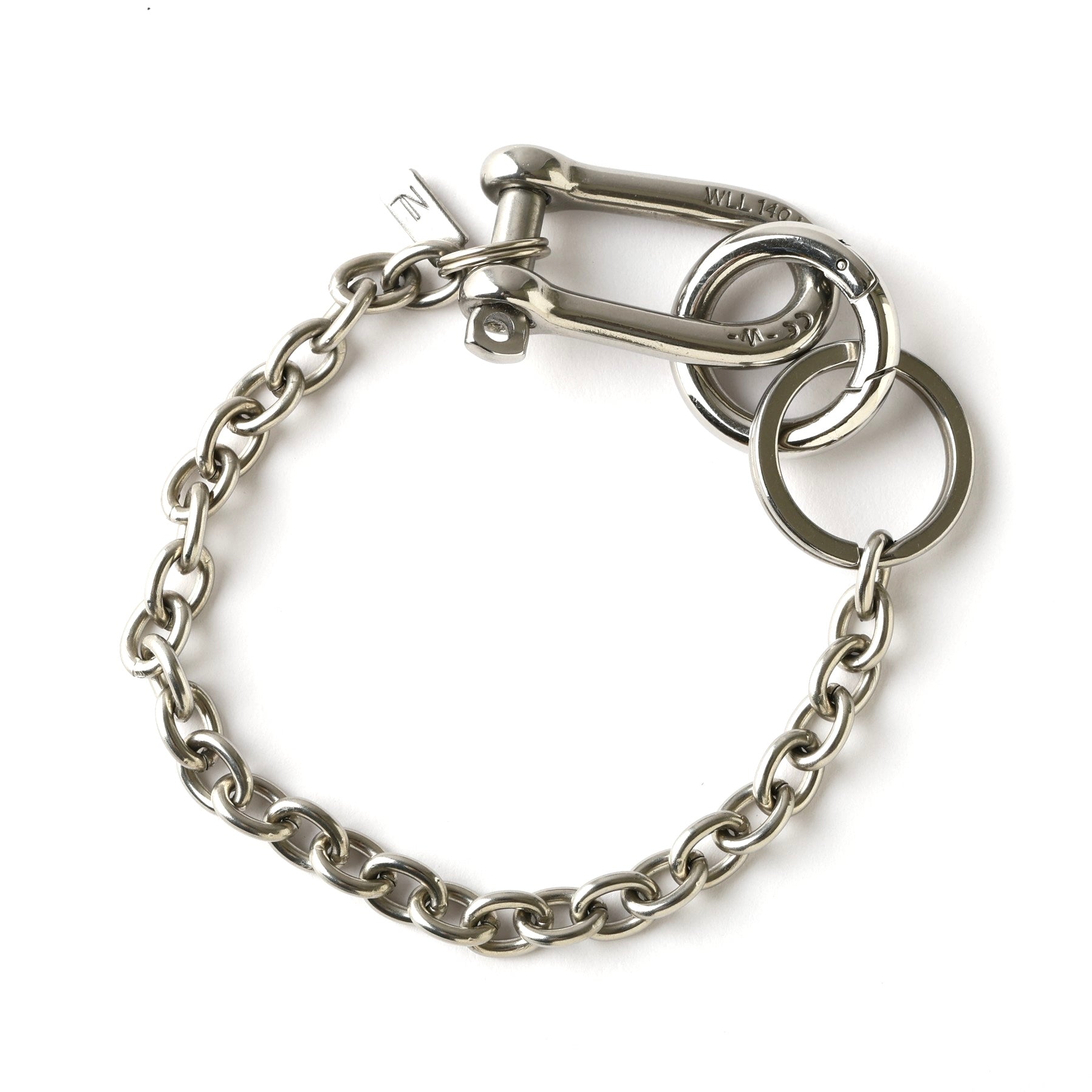 リング部分がバネフックになっており、シャックルに付けて留めるとブレスとして使用でき、そのまま外した状態でベルトループやカバンの取っ手などにつけて、キーホルダーとしても利用可能。